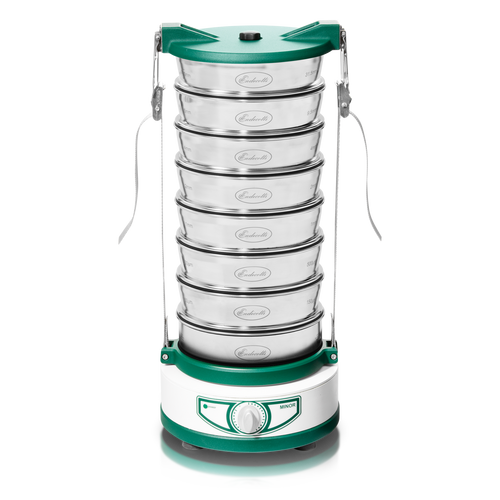 It is ideal for the use in laboratories and plants since it is compact and genuinely portable (weighing only 17kg). The sieve stack is held firmly in position by a clamping belt system. Removing it allows the whole unit to be stored in a space less than 200 mm high.
